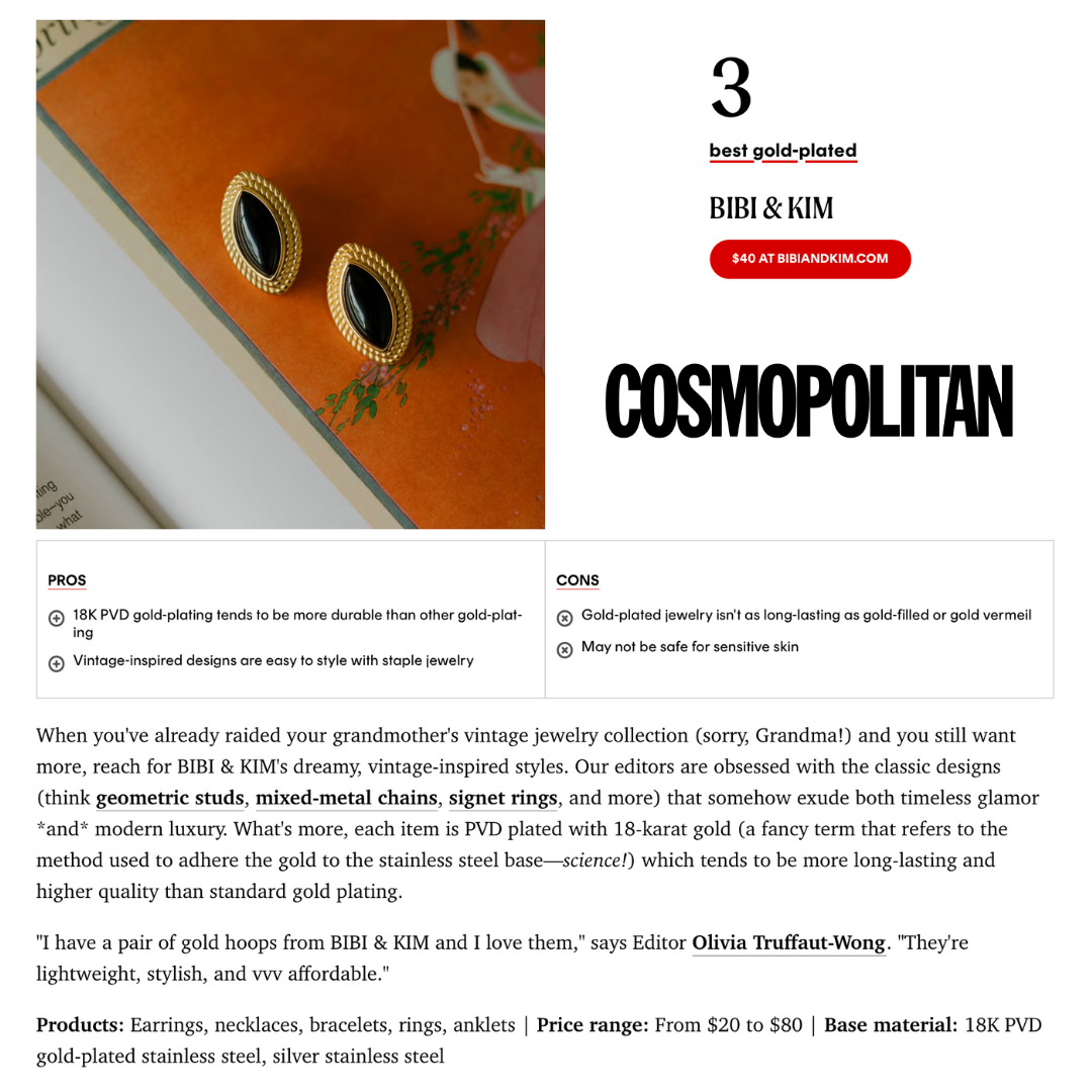 We’re proud to share that BIBI & KIM was ranked #3 on Cosmopolitan’s list of 17 Affordable Jewelry Brands as Best Gold-Plated. This recognition of our vintage-inspired, 18K PVD gold-plated designs is a major milestone for a brand that started as a heartfelt tribute to the founder’s late mother, Bibiana (BIBI), who passed away suddenly in April 2019.