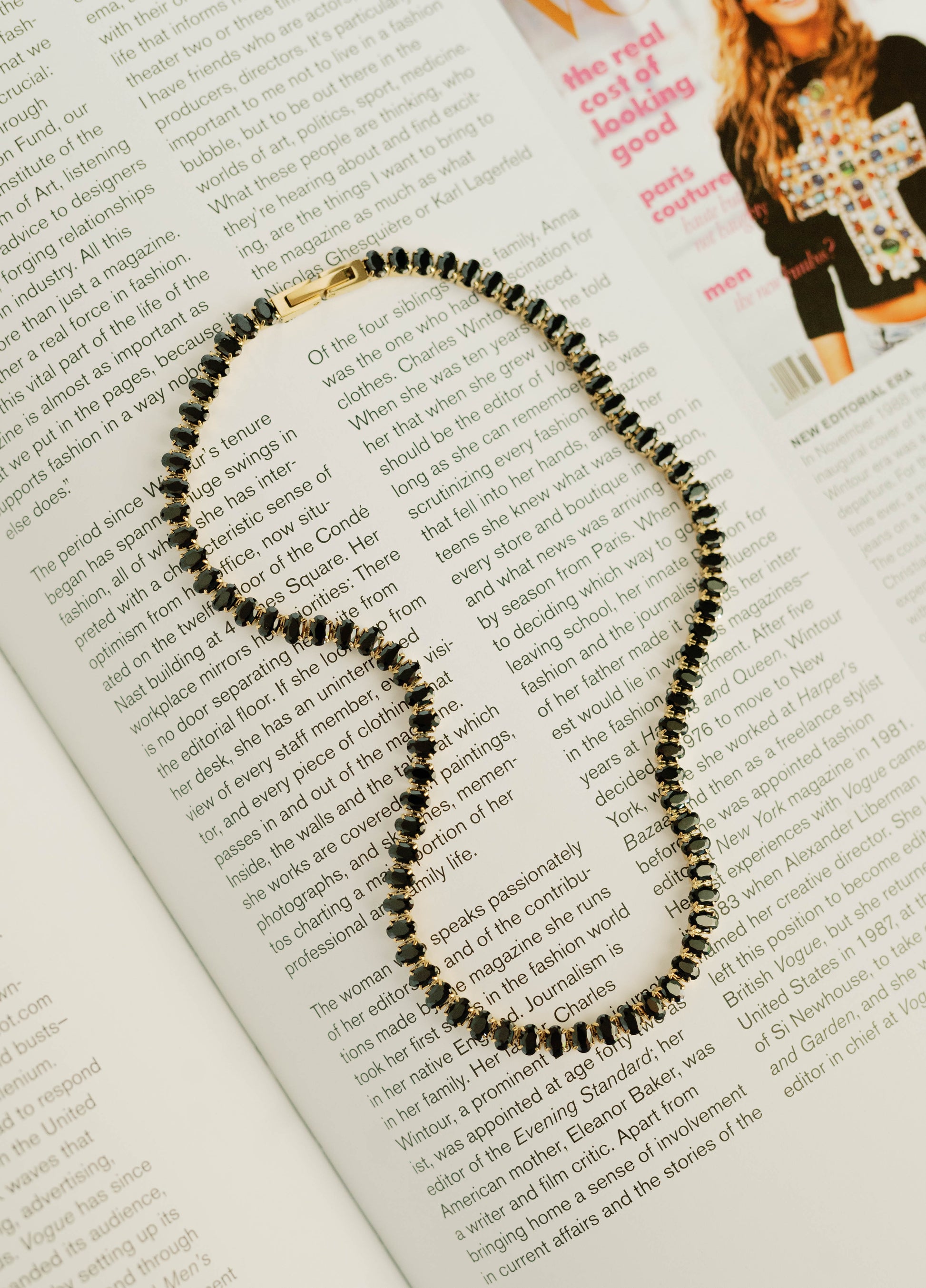 Dark elegance, meet timeless glam. This necklace features a full row of black cubic zirconia stones set in gold, bringing a bold edge to a classic silhouette. Perfect for layering or wearing solo when you want to make a statement.