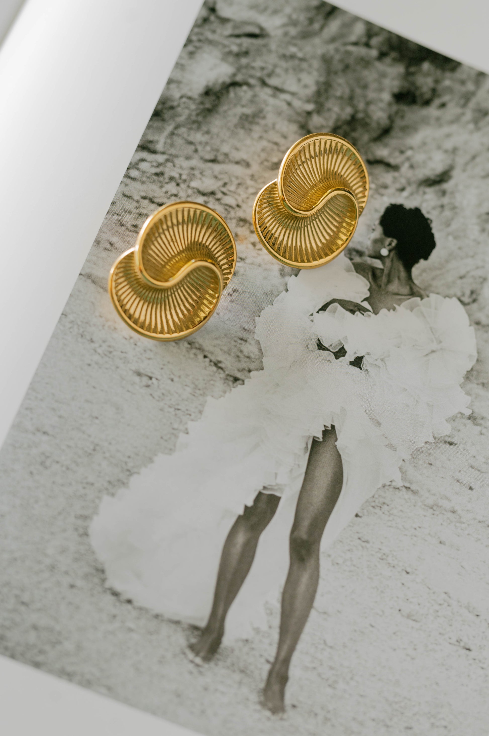 These gold fan-shaped statement earrings are all about bold curves and structured shine. With their sculptural silhouette and ridged texture, they’re the perfect mix of retro glam and modern edge. Medium weight and made to stand out, these are your go-to for elevating a sleek bun, a power suit, or your weekend fit.
