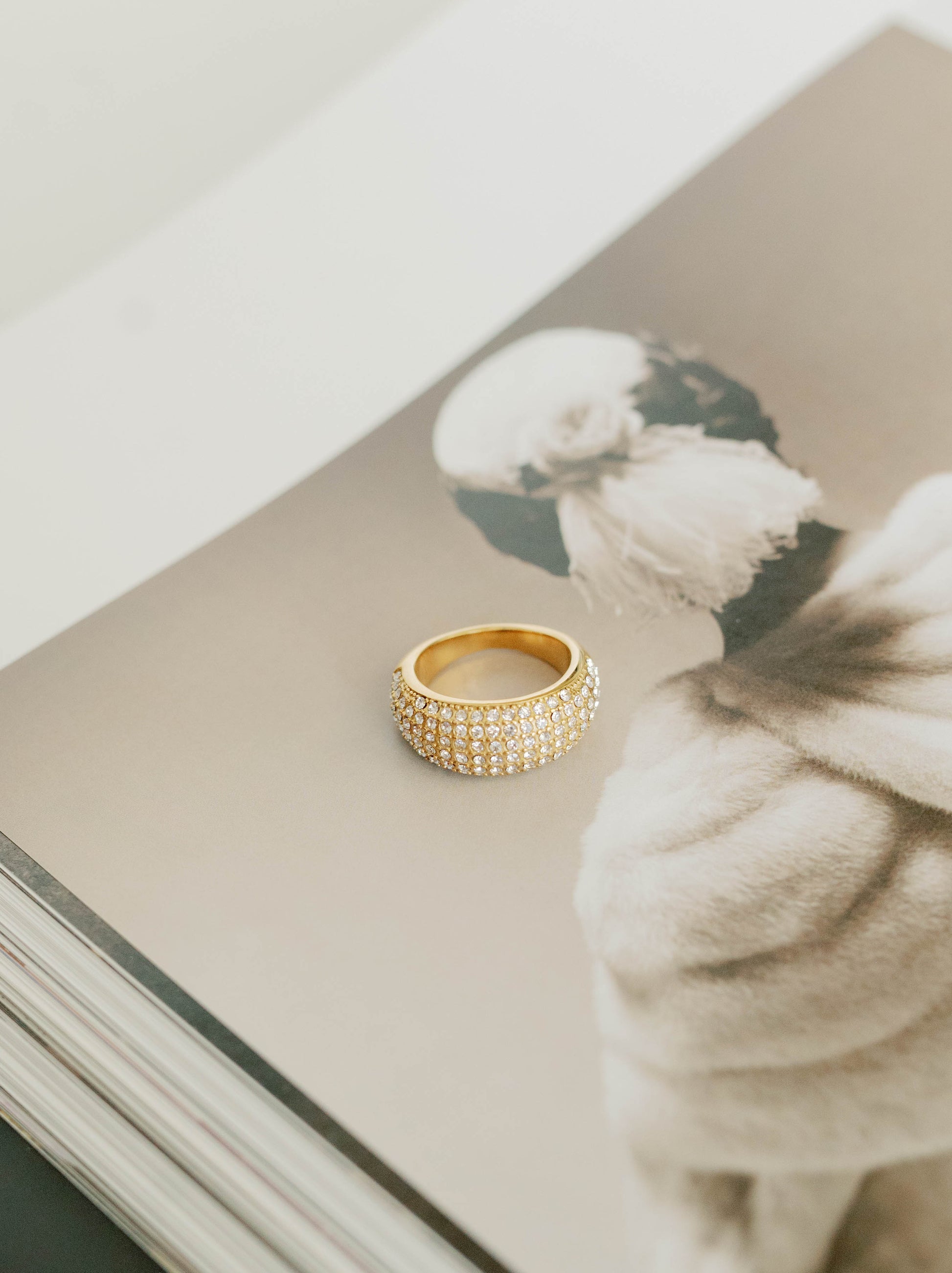 More sparkle, more drama. This bold dome ring is encrusted with rows of shimmering white cubic zirconia for a look that commands attention. It’s luxe, eye-catching, and ready to elevate any outfit.