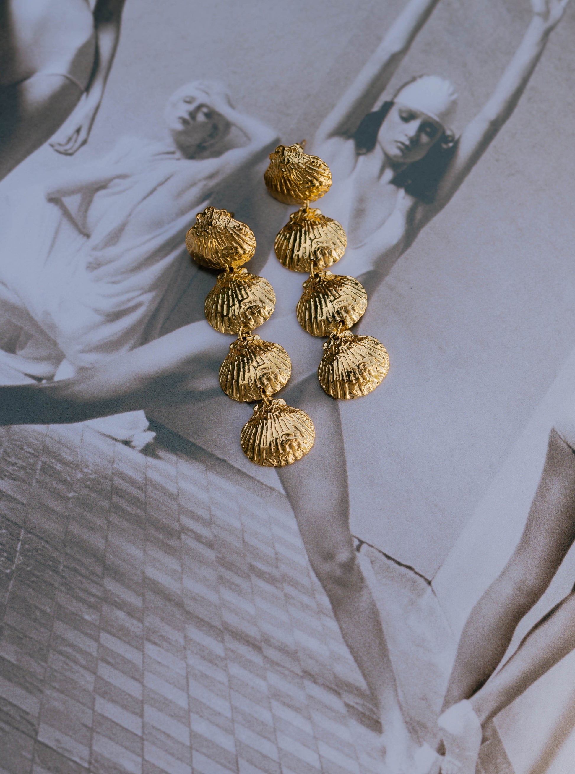 Make waves. These statement drops are lined with textured golden shells that shimmer with every move—bringing that bold, beach-glam energy wherever you go. Lightweight yet dramatic, they're made to stand out.
