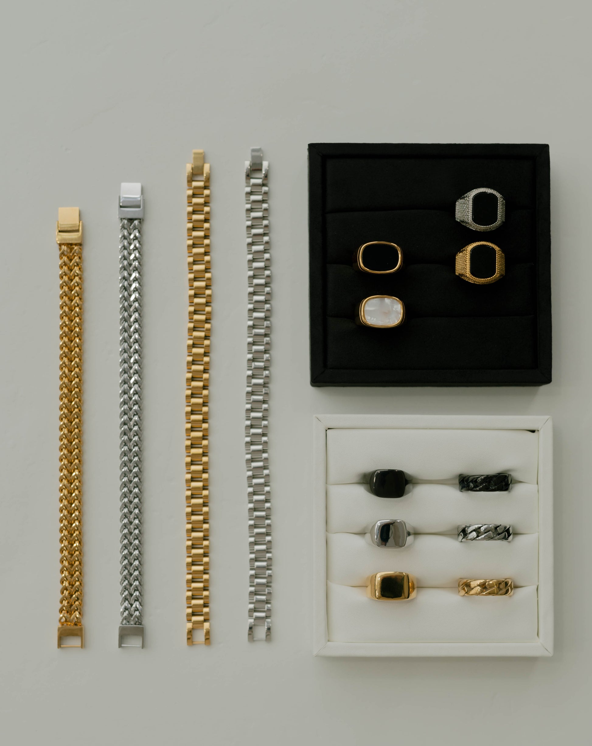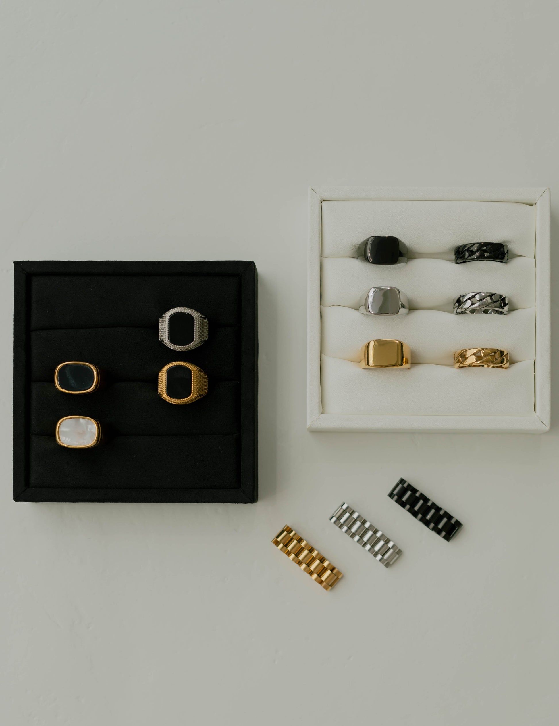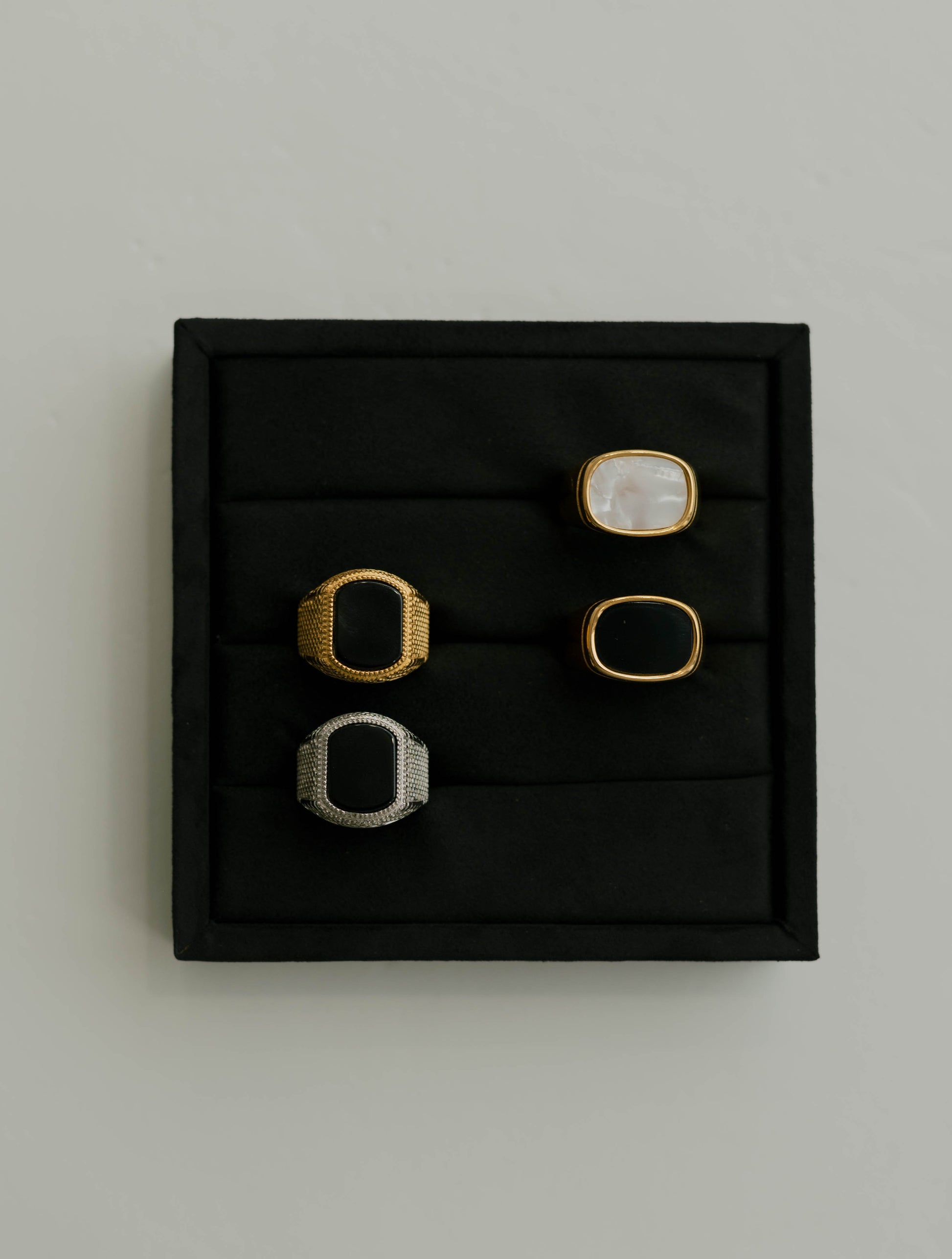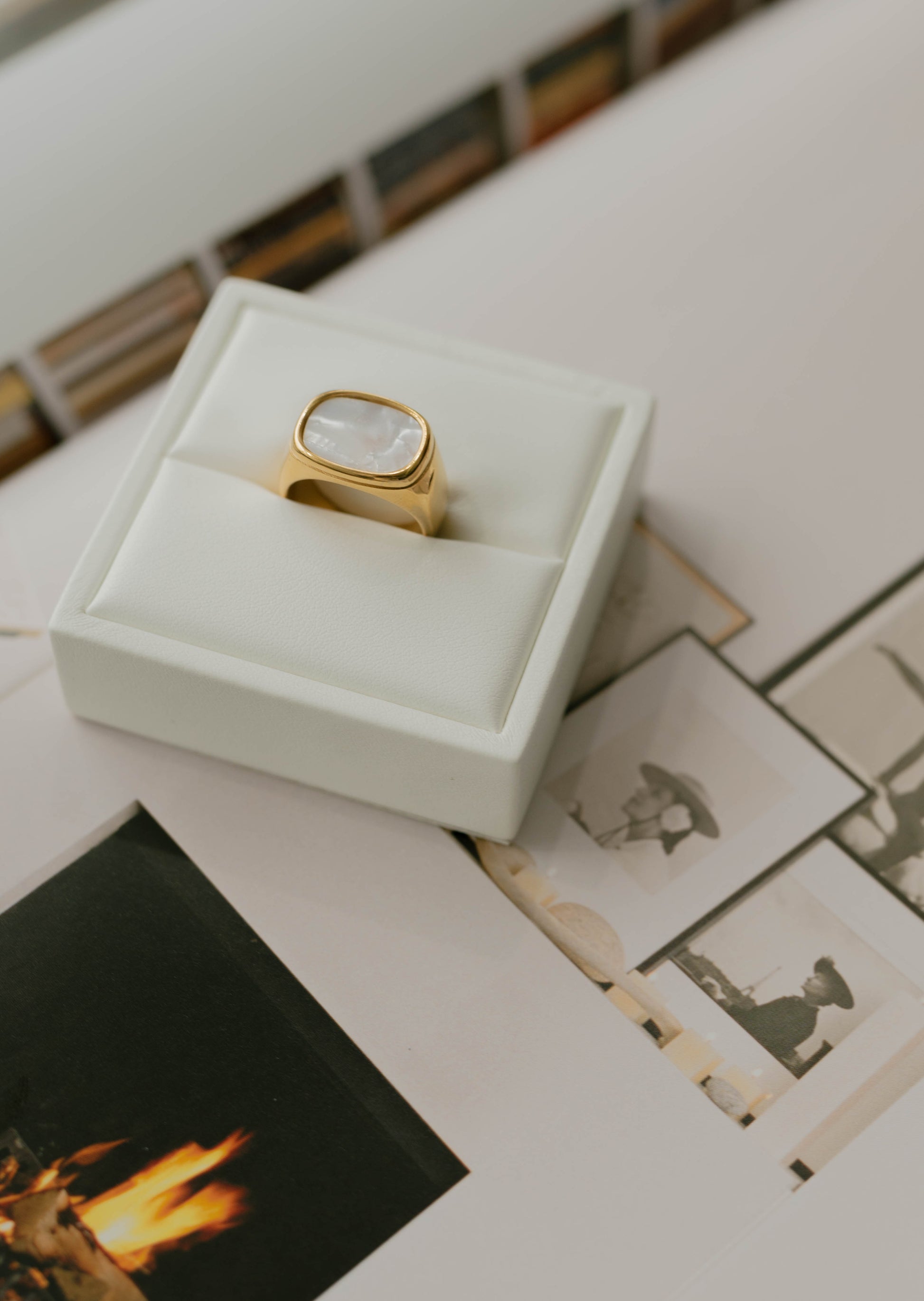 Clean lines, natural glow. This unisex signet ring is set with luminous mother of pearl, offering a polished, refined finish that works with everything.