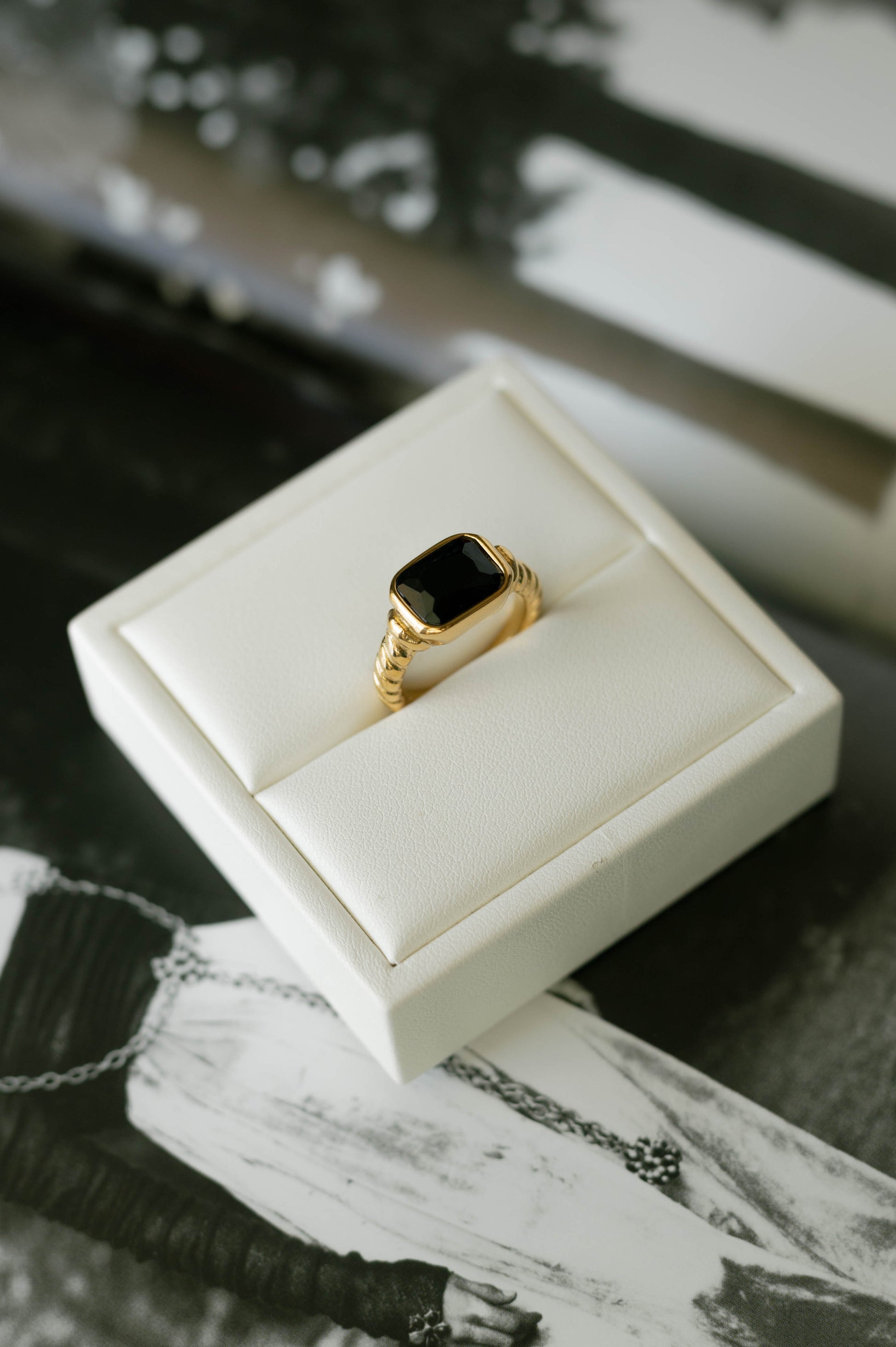 Bold, sculptural, and endlessly versatile. The Sculpted Gem Ring features a deep black cubic zirconia stone set on a twisted gold band, a modern take on vintage glamour that elevates any look.