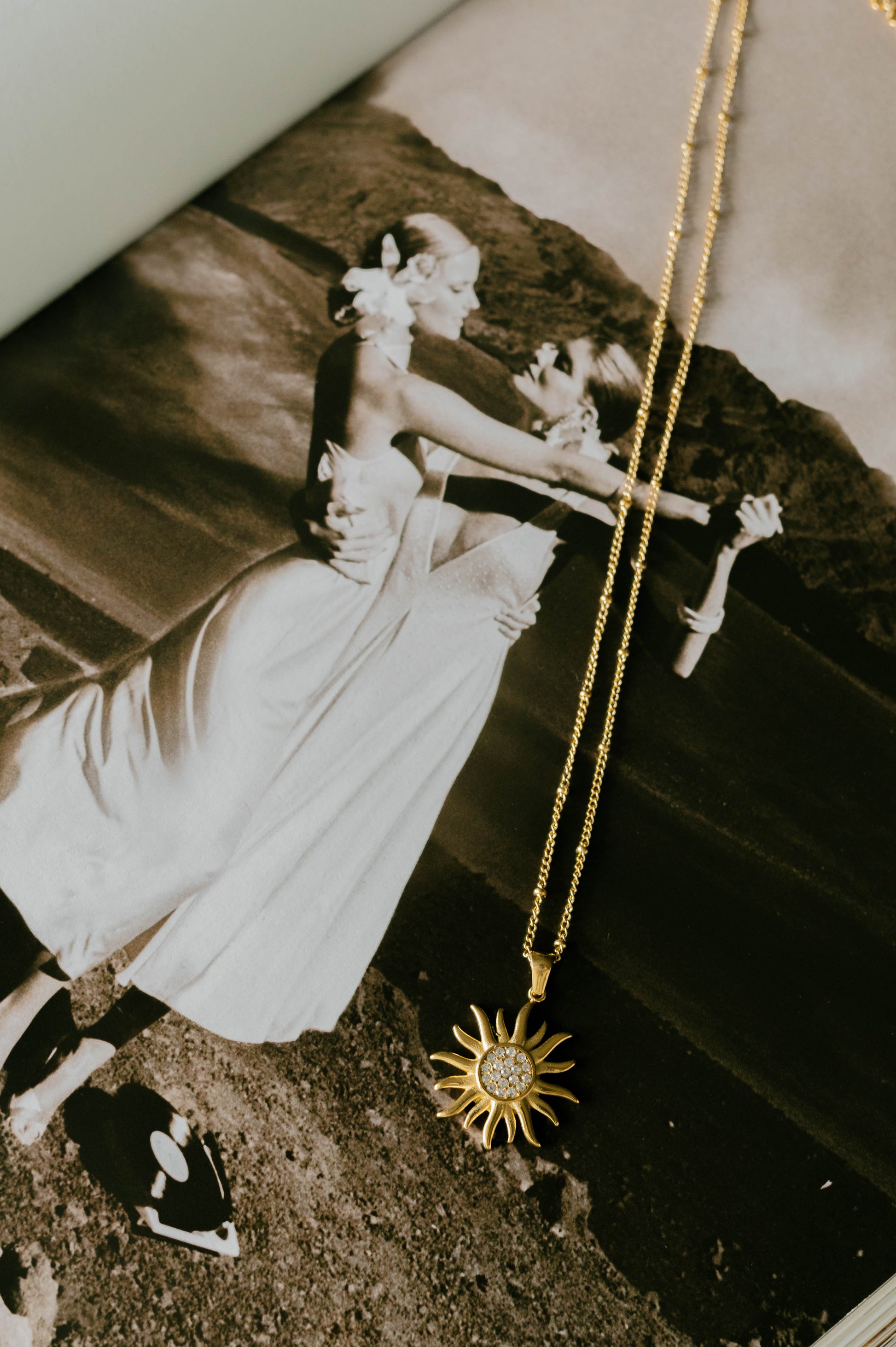 Bring the sunshine wherever you go. This gold sunburst pendant sparkles with white cubic zirconia at the center, radiating effortless glow and good vibes.