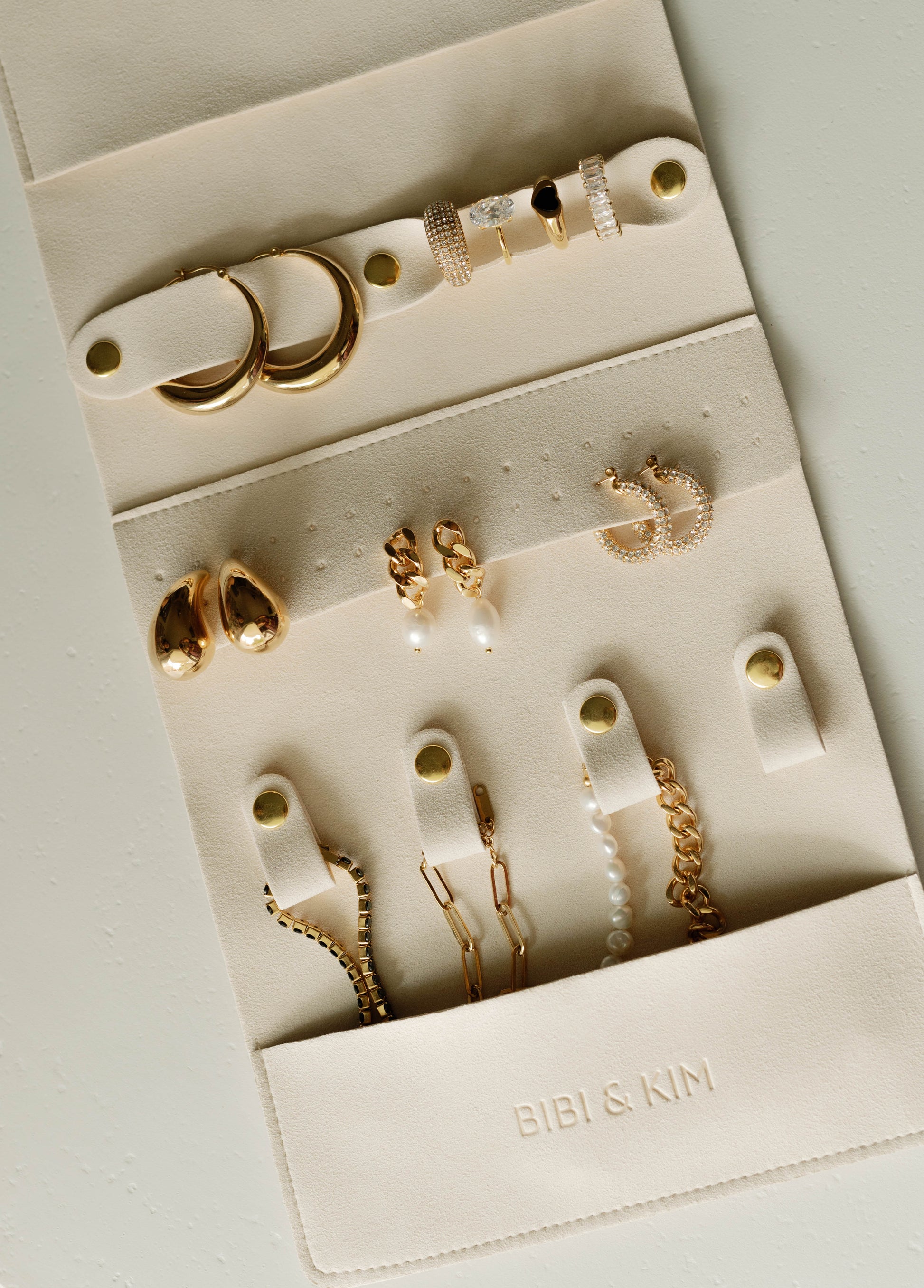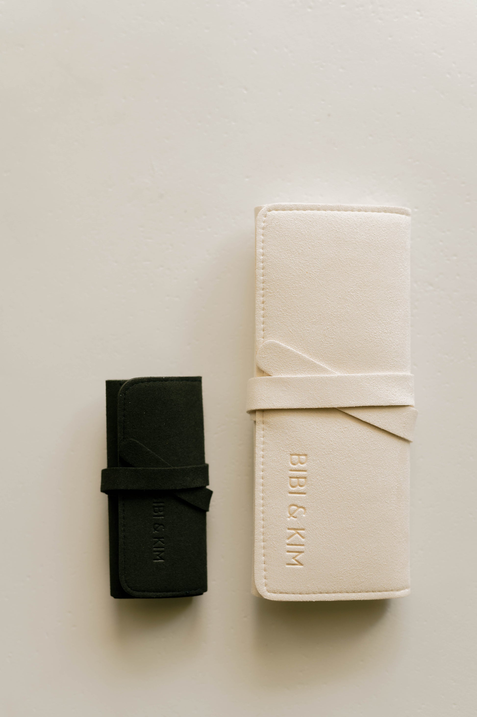 A statement in travel elegance. Our full-size cream organizer is made from luxury 1.4mm microfiber with gold-tone details and our custom BIBI & KIM logo. Designed to hold your favorite pieces safely, without compromising on style.
